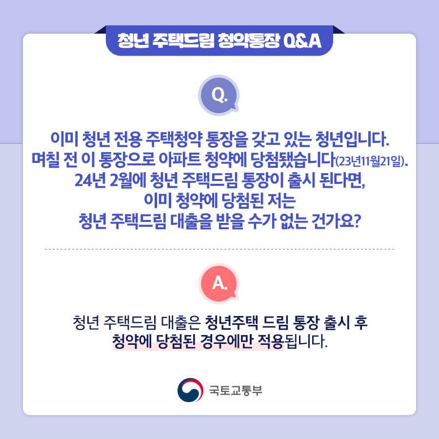 1. 이미 청년 전용 주택청약 통장을 가지고 있고, 얼마 전 해당 통장으로 아파트 청약에 당첨되었을 경우, 청년 주택드림 대출은 받는 것은 불가능한가요?