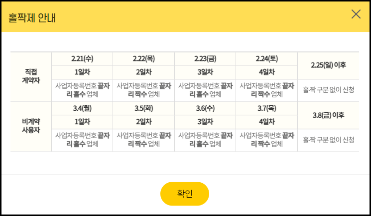 소상공인 전기요금 특별지원 신청기간은 직접 계약자와 비계약 사용자가 다릅니다. 우선 공통사항은 안정적인 사이트 이용을 위해, 접수 개시 첫 4일간은 사업자등록번호 끝자리를 기준으로 홀짝제를 운영한다는 것입니다.