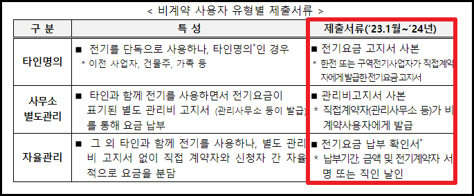 비계약자분들은 한전과 직접 계약이 되어 있지 않기 때문에 전기 요금의 정확한 납부내역을 확인하기가 곤란하여 신청 시 별도의 서류를 제출해야 합니다. (제출해야 하는 서류는 아래에서 설명해 드립니다.)